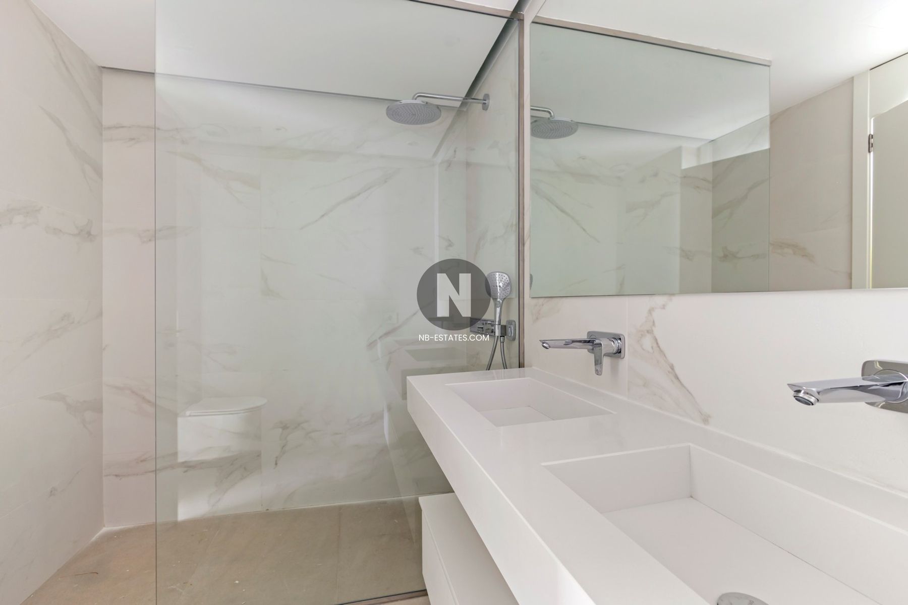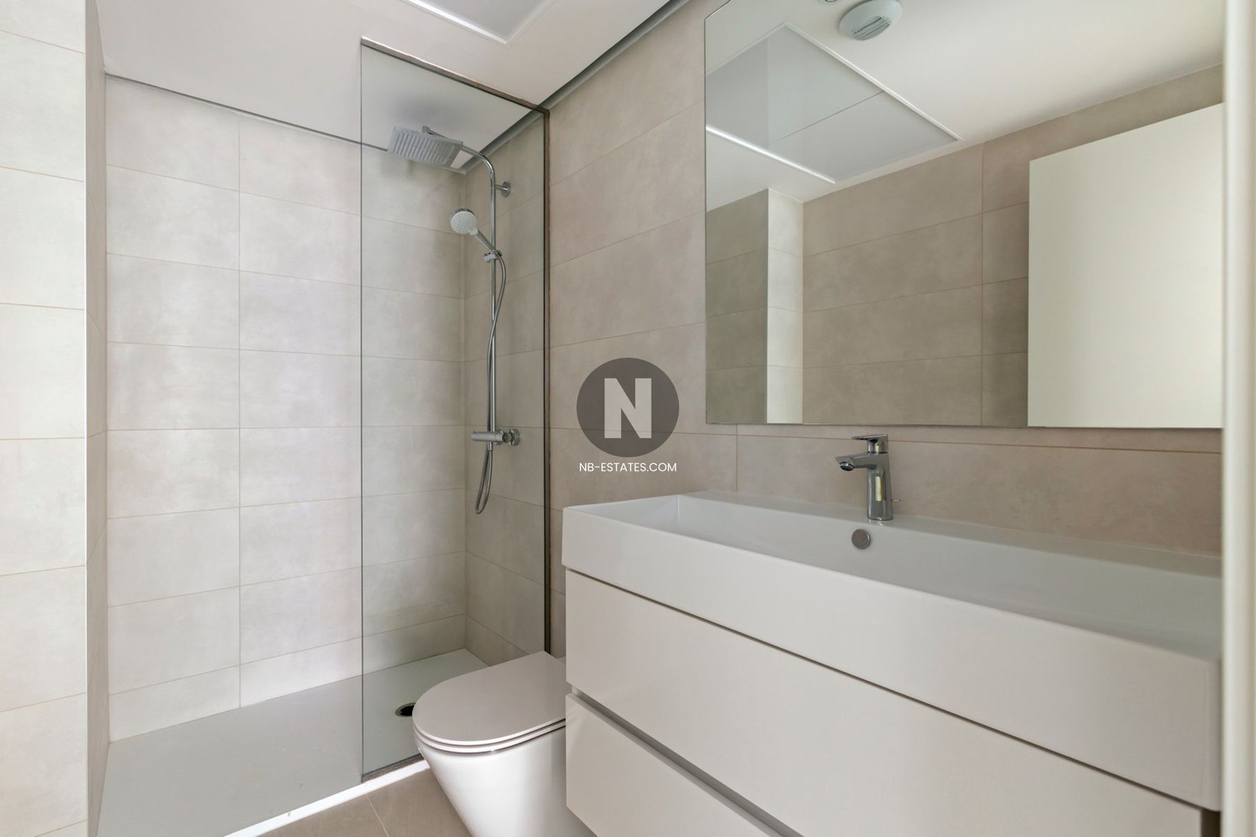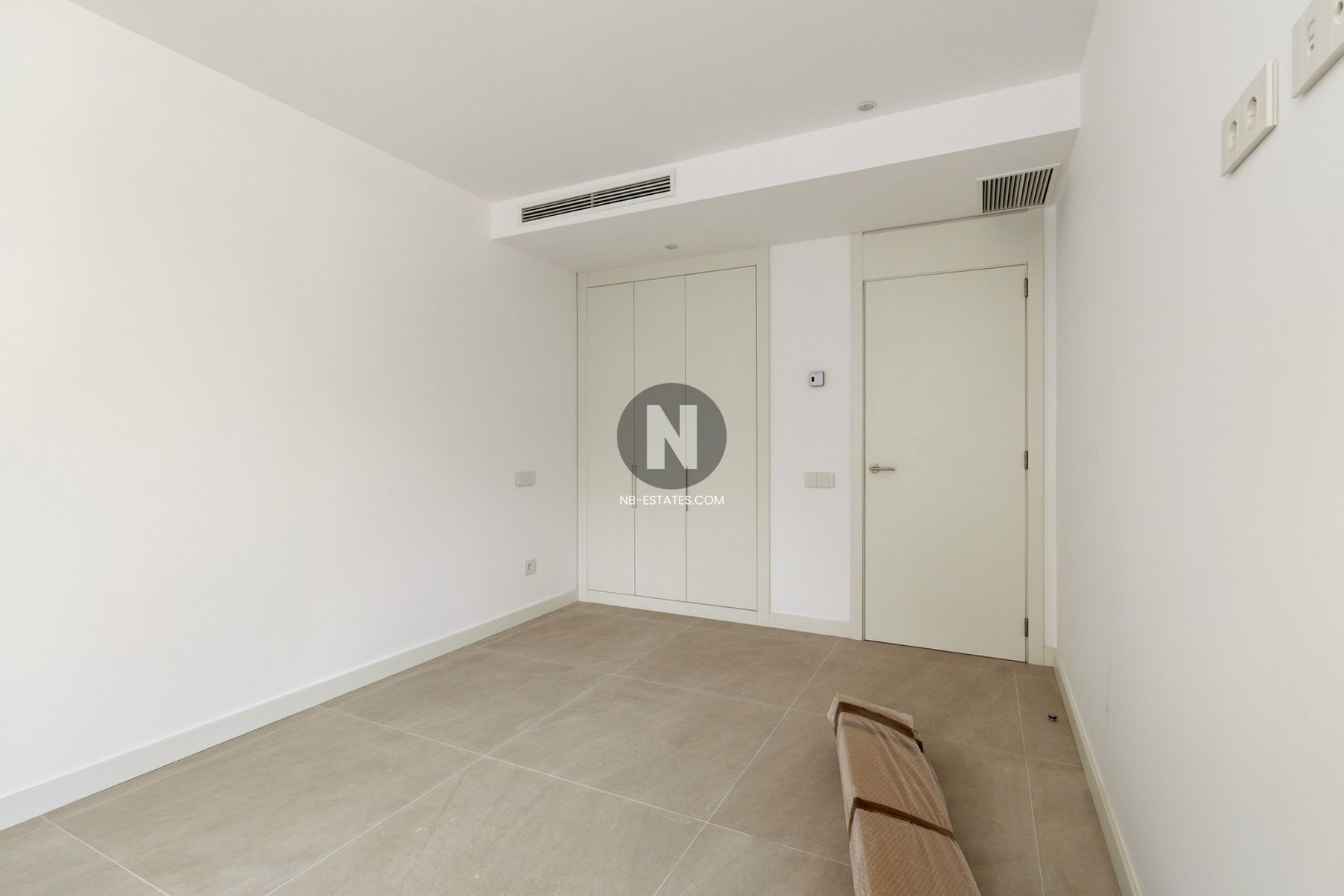 Dieses Penthouse besticht durch seine großzügige Breite. Der Wohnbereich ist nicht weniger als 41,15 m² groß, mit einer Fassadenbreite von ca. 8 m und direktem Zugang zur vorderen Terrasse von 28 m². Im hinteren Bereich befinden sich zwei Schlafzimmer, eines davon en suite, sowie ein Gäste-Badezimmer. Beide Schlafzimmer haben direkten Zugang zur hinteren Terrasse von 8,45 m².