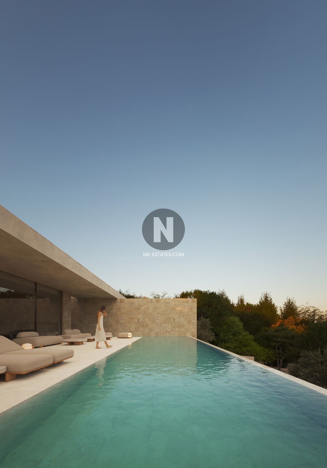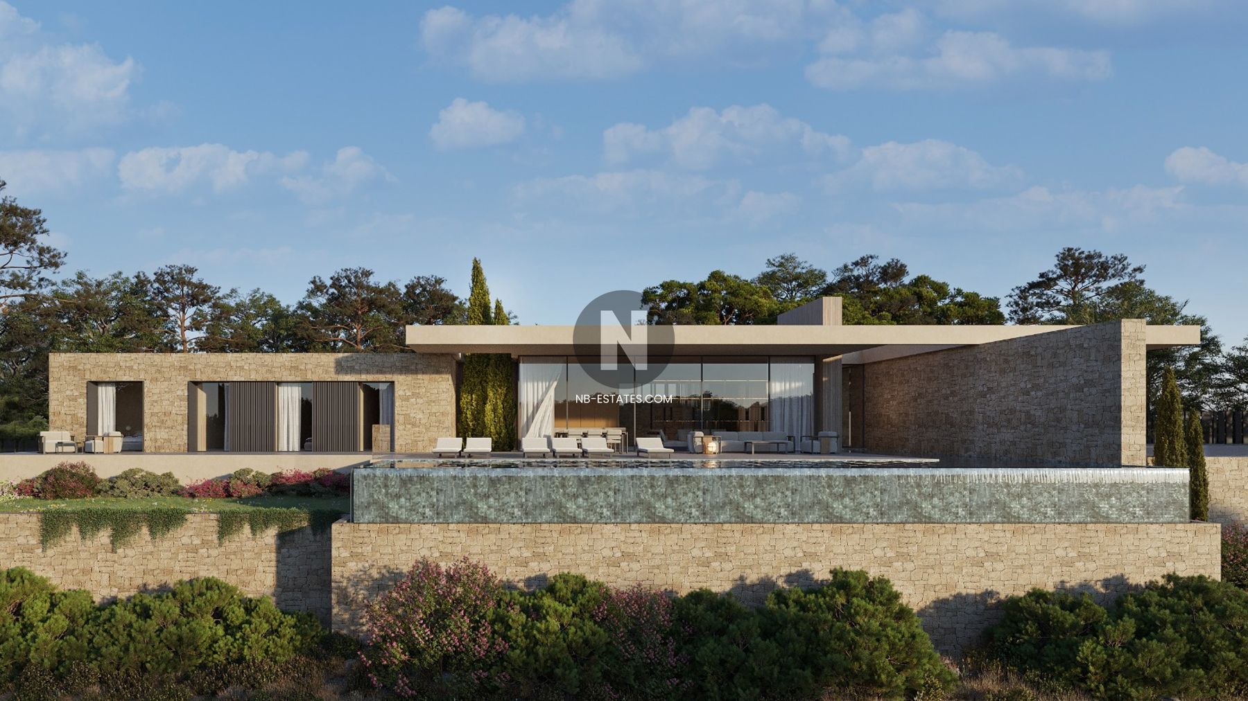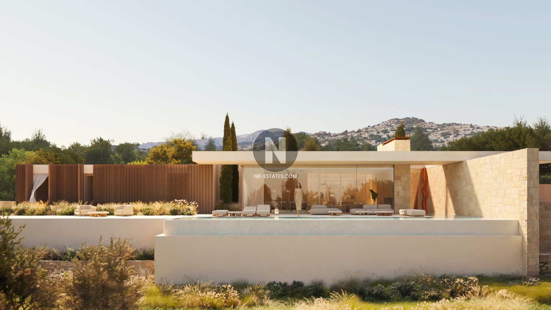 La villa ha sido diseñada para aprovechar al máximo la conexión entre interior y exterior. Los grandes ventanales permiten una entrada abundante de luz natural y crean una transición fluida hacia las terrazas y la zona de piscina. La piscina infinity ofrece vistas abiertas al entorno, aportando una sensación de amplitud y tranquilidad.