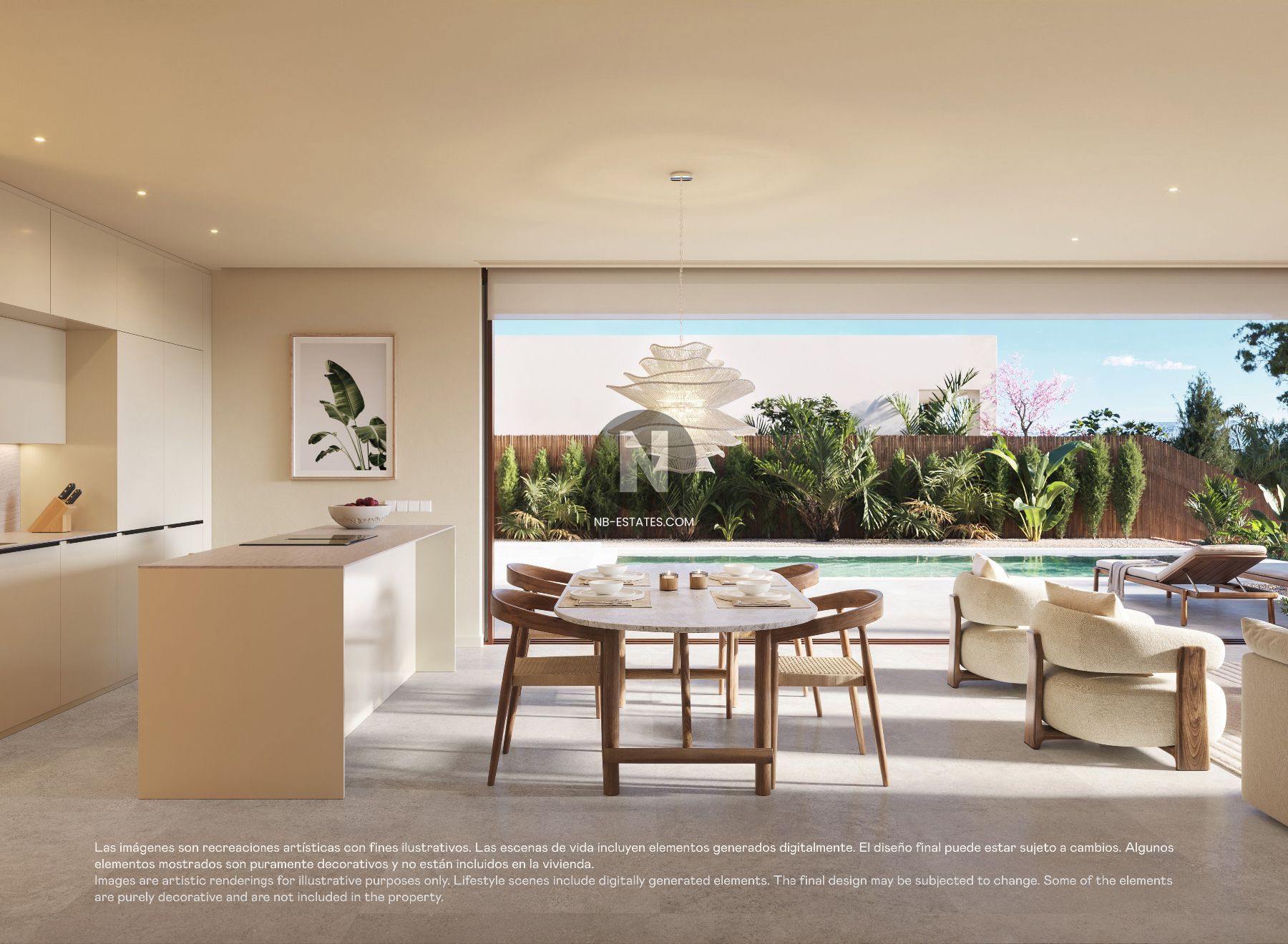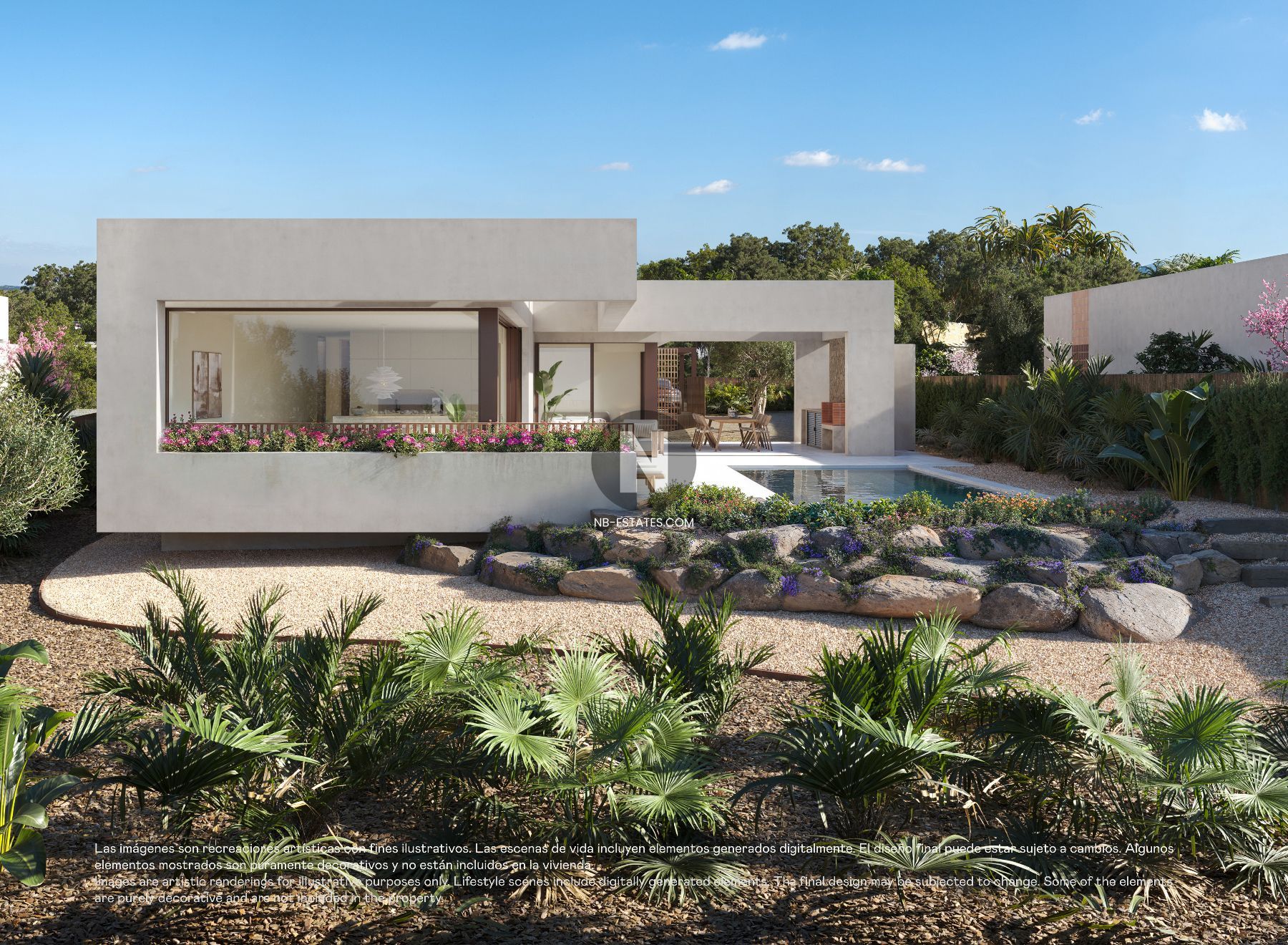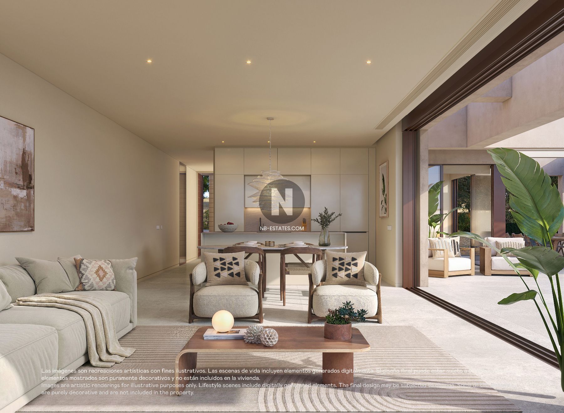 Las villas están diseñadas para ofrecer luminosidad, amplitud y una conexión directa con el exterior. Los grandes ventanales conectan el salón con la terraza y el jardín con piscina, creando una transición natural entre el interior y el exterior. La zona exterior incluye terrazas y una zona de barbacoa, ideal para disfrutar del clima mediterráneo durante todo el año.