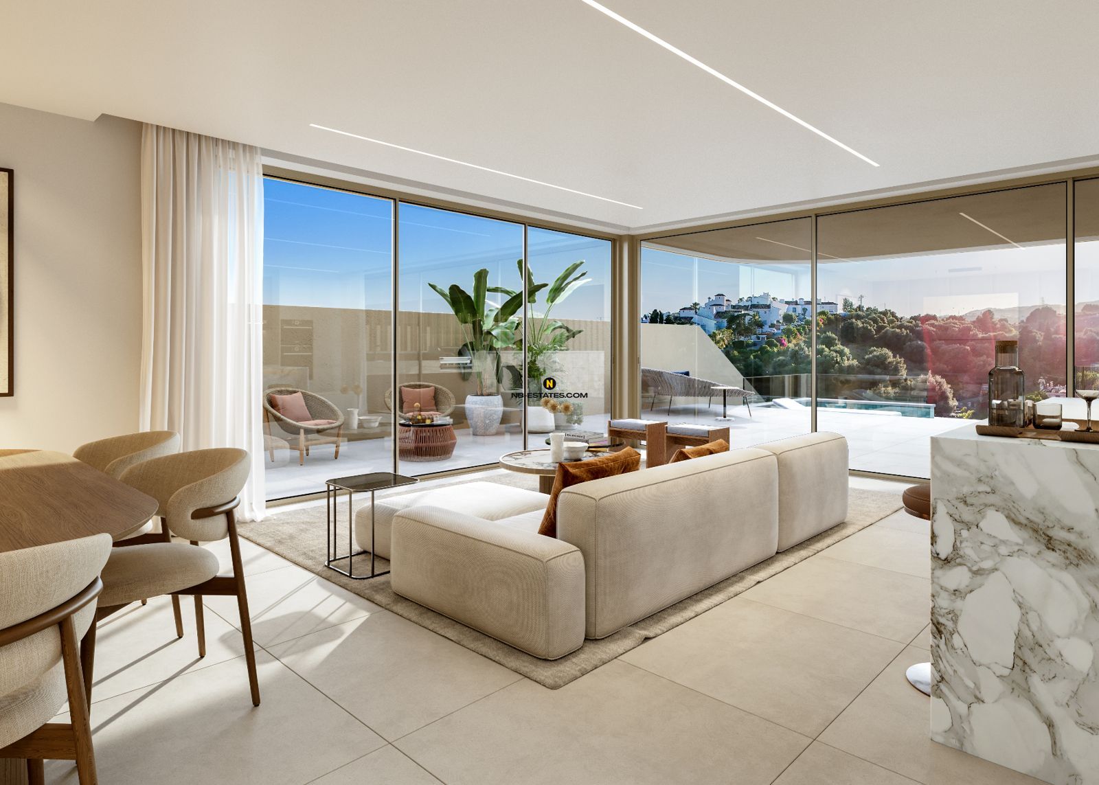 Les intérieurs sont pensés pour maximiser la lumière naturelle et la fonctionnalité. Les grandes baies vitrées créent une continuité naturelle entre les espaces intérieurs et extérieurs, favorisant un mode de vie fluide et agréable tout au long de l’année.