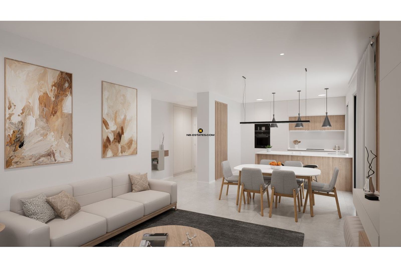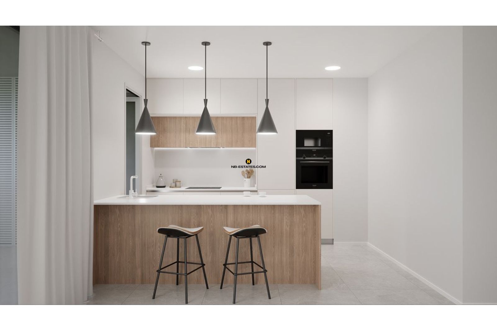 De appartementen zijn afgewerkt met duurzame en onderhoudsvriendelijke materialen. De open woon- en eetruimtes sluiten naadloos aan op de terrassen, wat zorgt voor veel lichtinval en een aangenaam binnen-buitengevoel. Bewoners beschikken bovendien over een gemeenschappelijk zwembad op een verhoogd terras, ideaal om te ontspannen en te genieten van het mediterrane klimaat.
