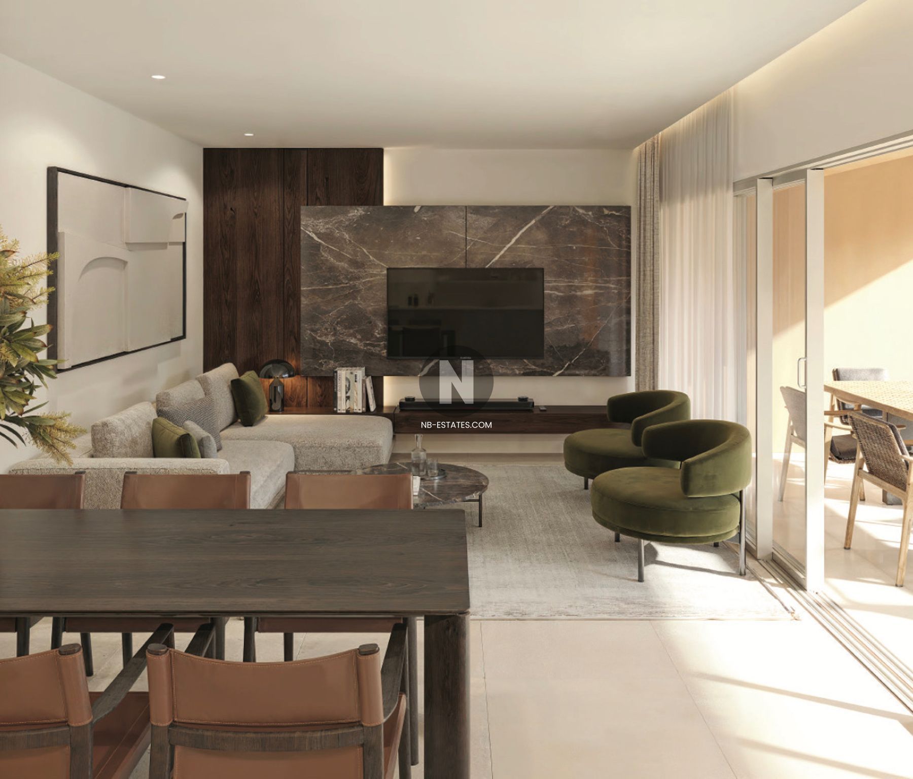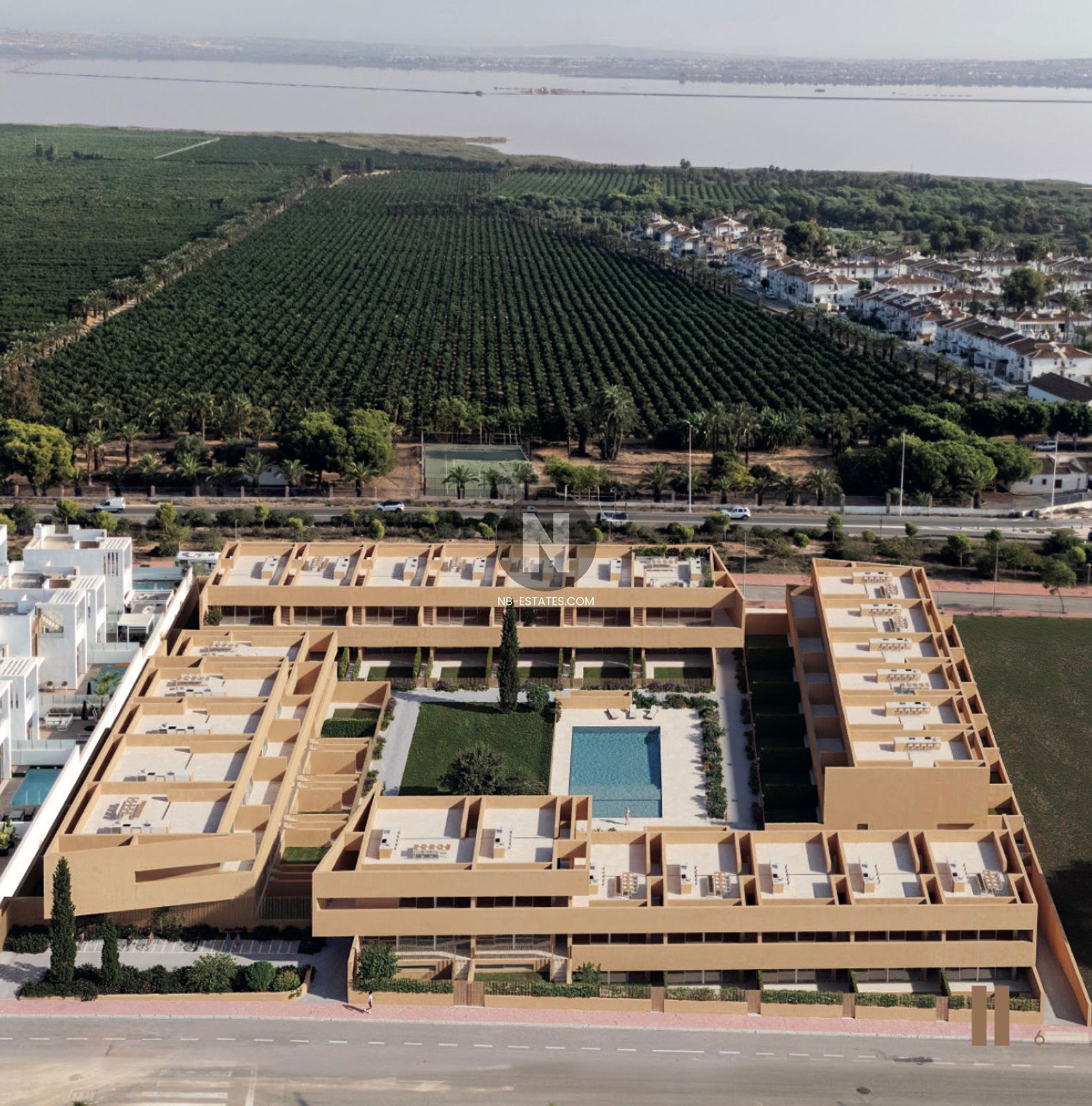 De woningen zijn verdeeld over meerdere lage gebouwen rondom een centrale tuin en gemeenschappelijke zones. Het ontwerp zorgt voor voldoende lichtinval en privacy, terwijl u tegelijkertijd gebruik kunt maken van gedeelde faciliteiten zoals het zwembad en wandelpaden. De appartementen zijn praktisch ingedeeld, met ruime terrassen die het binnen- en buitenleven met elkaar verbinden.
