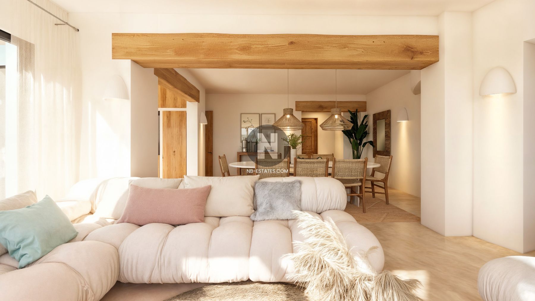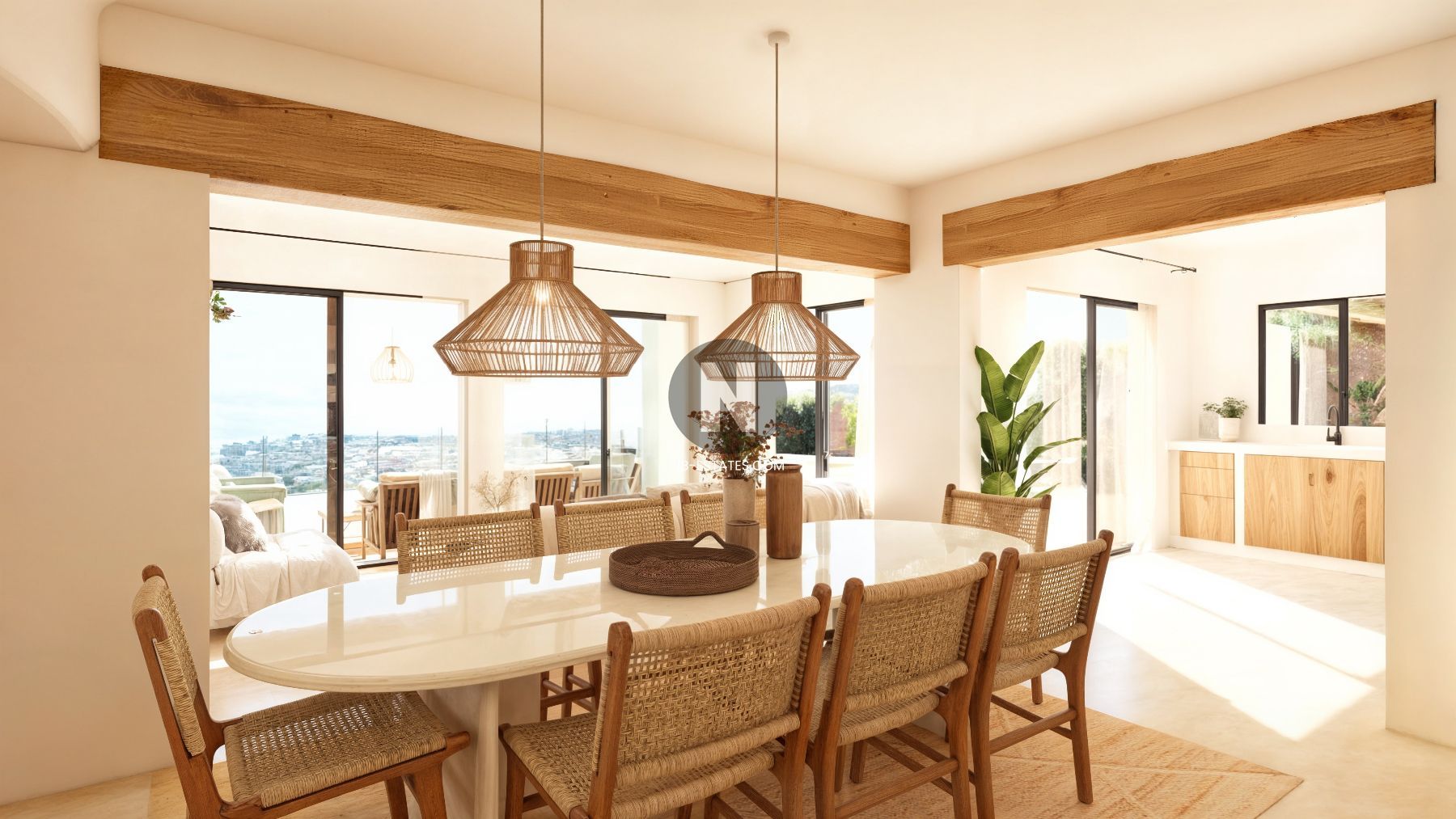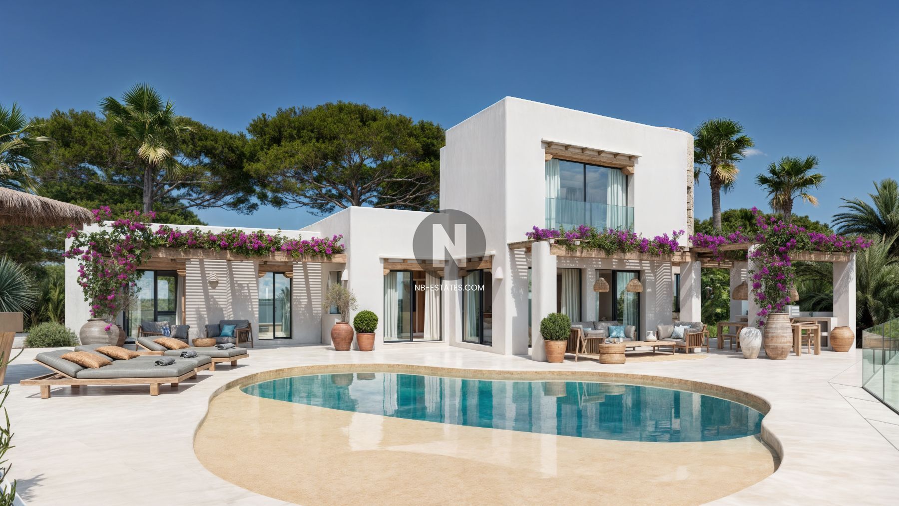 De villa is ontworpen met aandacht voor het mediterrane leven, waarbij binnen- en buitenruimtes naadloos in elkaar overlopen. Grote raampartijen zorgen voor veel natuurlijk licht en verbinden de leefruimtes met de terrassen en het zwembad. De buitenzone is ingericht met verschillende zit- en ontspanningsruimtes, ideaal om het hele jaar door te genieten van het klimaat in de regio.